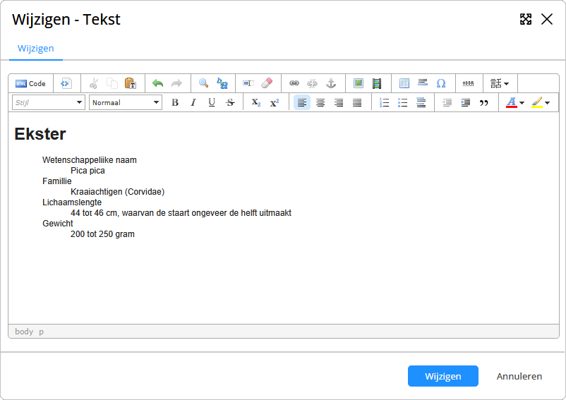 HTML-editor. Content in de WYSIWYG editor wordt omgezet in HTML-code. Met de HTML-editor kun je deze bekijken en bewerken. Vergeet niet de editor af te sluiten voor je op 'Invoegen' of 'Wijzigen' klikt. De editor vult dan automatisch missende code aan.