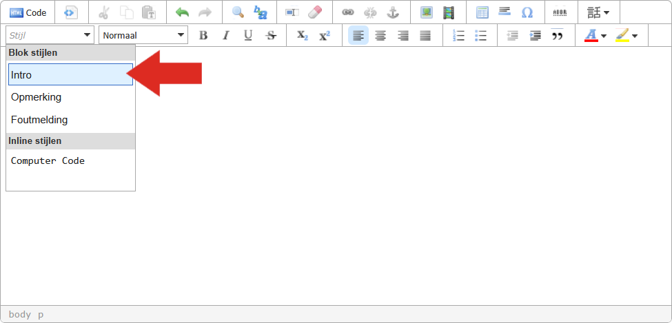 In de teksteditor in Sitebox intranet kun je voortaan de blok stijl 'Intro' gebruiken.